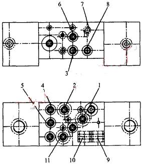 (1.電磁閥 DT3 2.電磁閥 DT2 3.截止閥1 4.截止閥 3 5.截止閥2 6.溢流閥 RV 7.測(cè)壓接頭 MP 8.截止閥 4 9.壓力開(kāi)關(guān) KP2 10.壓力開(kāi)關(guān) KP1 11.電磁閥 DT1)