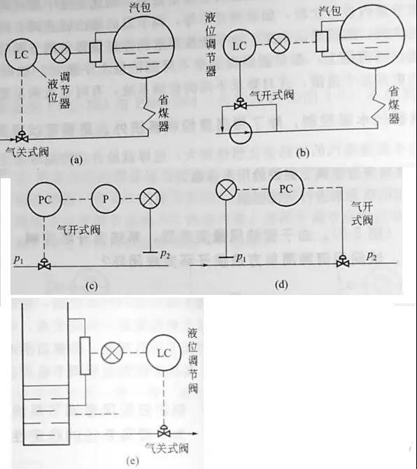 圖2-5(e)不合理。塔釜為恒定加熱量。當受某種擾動使釜溫上升時,氣開閥將開大,放出一部分重組分物料,塔釜物料的減少,使塔內溫度上升更快,從而構成一個正反饋系統,不能正常工作,降溫亦如此。