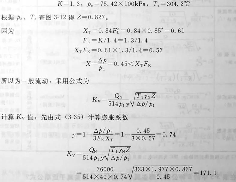 蒸氣質量流量Ws=35000kg/h,p1=4050kPa,p2=5000kPa,絕熱指數K=1.3,t=368℃,ρs=14.33kg/m3。若選用套筒調節閥,求流量系數。解 查表3-1得,XT=0.75