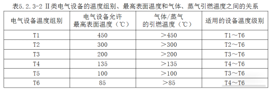 5.2.3 防爆電氣設備的級別和組別不應低于該爆炸性氣體環境內爆炸性氣體混合物的級別和組別,并應符合下列規定:2 Ⅱ類電氣設備的溫度組別、高表面溫度和氣體、蒸氣引燃溫度之間的關系符合表5.2.3-2的規定。