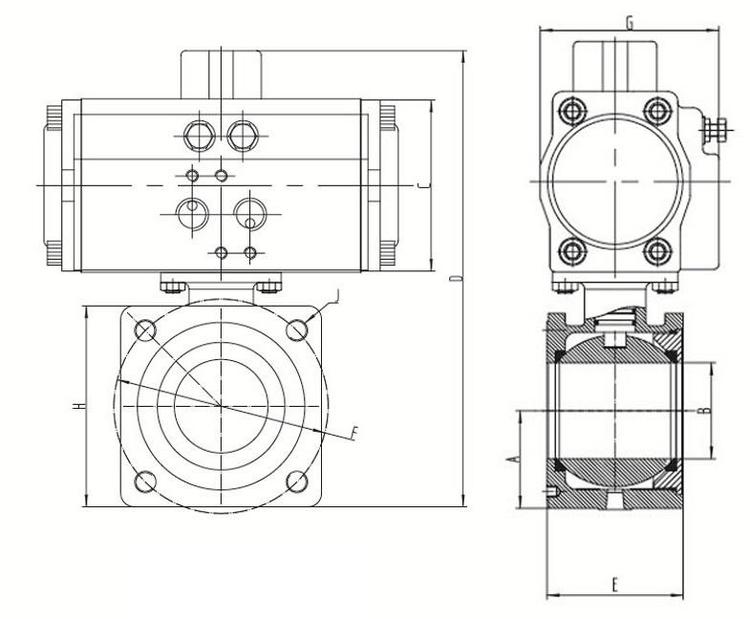 氣動方球閥主要用鑄鐵、不銹鋼、聚四氟乙烯等加工而成。主要結構及連接尺寸如下圖及表