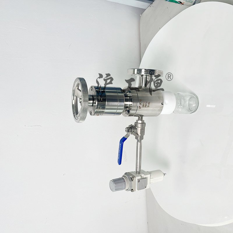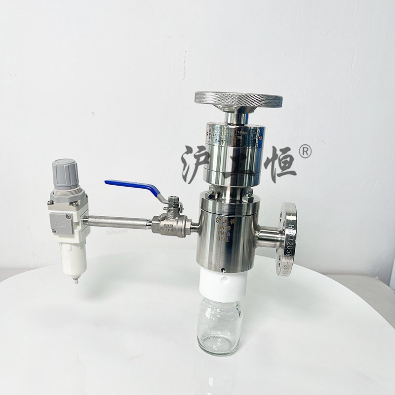 罐底取樣閥-帶反吹掃-配PFA取樣瓶,解決了現有取樣閥的復雜結構,取樣瓶采用PFA材質,可取樣為腐蝕性介質,罐底取樣閥-帶反吹掃配PFA取樣瓶主要有閥體、閥芯、閥桿、閥座、密閉針、帶膜片取樣瓶組成,取樣瓶為可拆卸設計,試樣從入料針進入取樣瓶內,并通過排氣針排出壓力,使取樣瓶保持在常壓狀態,取樣瓶品裝有橡膠膜可將取樣瓶密封,避免污染試樣,流道無流阻設計,不影響流量,閥桿通過手柄、電動執行機構、氣動執行機構旋轉帶動閥桿及閥芯,閥芯上下提拉,可精確控制流量,實現試樣進入取樣瓶內,取樣瓶可選透明和避光兩種,本取樣閥廣泛應用在制藥、化工、食品行業。