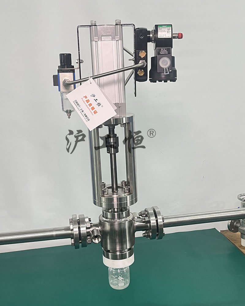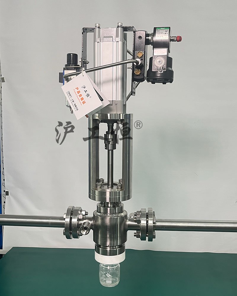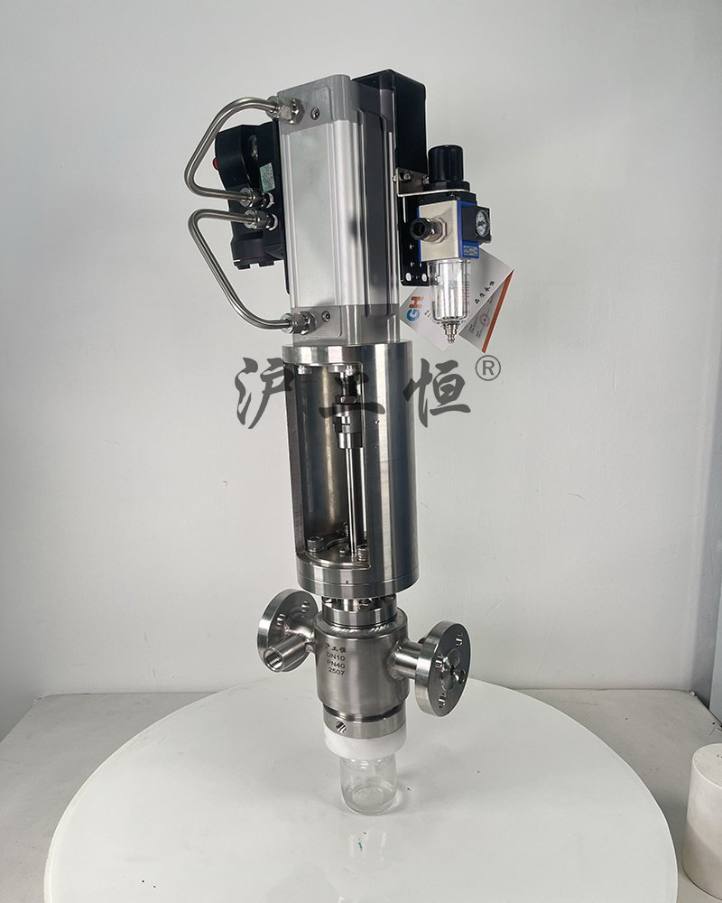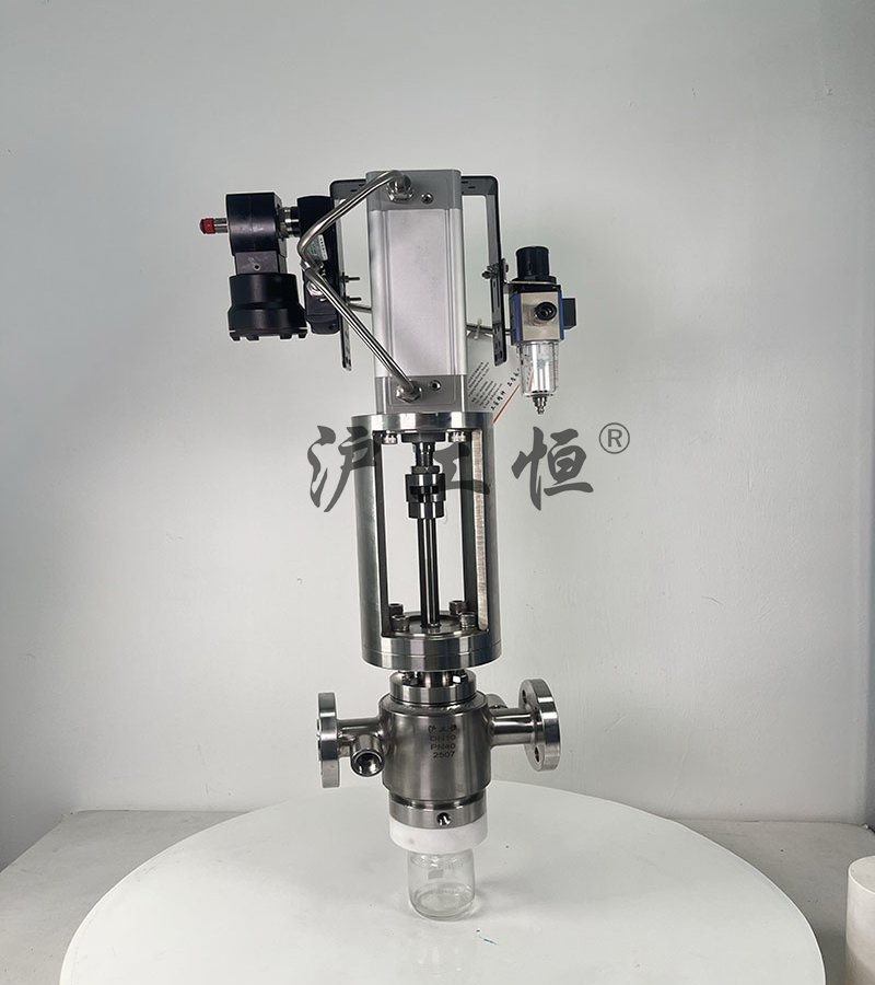 氣動柱塞式定量取樣閥,解決了現(xiàn)有取樣閥的復(fù)雜結(jié)構(gòu),取樣瓶采用PFA材質(zhì),可取樣為腐蝕性介質(zhì),氣動柱塞式定量取樣閥主要有閥體、閥芯、閥桿、閥座、密閉針、帶膜片取樣瓶組成,取樣瓶為可拆卸設(shè)計,試樣從入料針進入取樣瓶內(nèi),并通過排氣針排出壓力,使取樣瓶保持在常壓狀態(tài),取樣瓶品裝有橡膠膜可將取樣瓶密封,避免污染試樣,流道無流阻設(shè)計,不影響流量,閥桿通過手柄、電動執(zhí)行機構(gòu)、氣動執(zhí)行機構(gòu)旋轉(zhuǎn)帶動閥桿及閥芯,閥芯上下提拉,可精確控制流量,實現(xiàn)試樣進入取樣瓶內(nèi),取樣瓶可選透明和避光兩種,本取樣閥廣泛應(yīng)用在制藥、化工、食品行業(yè)。